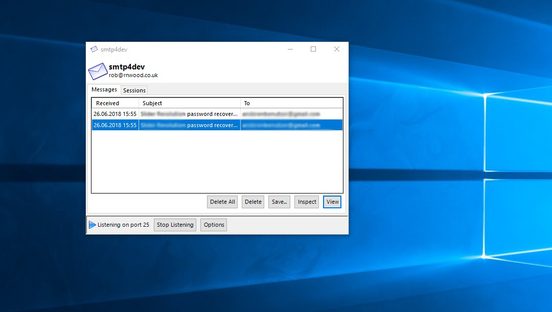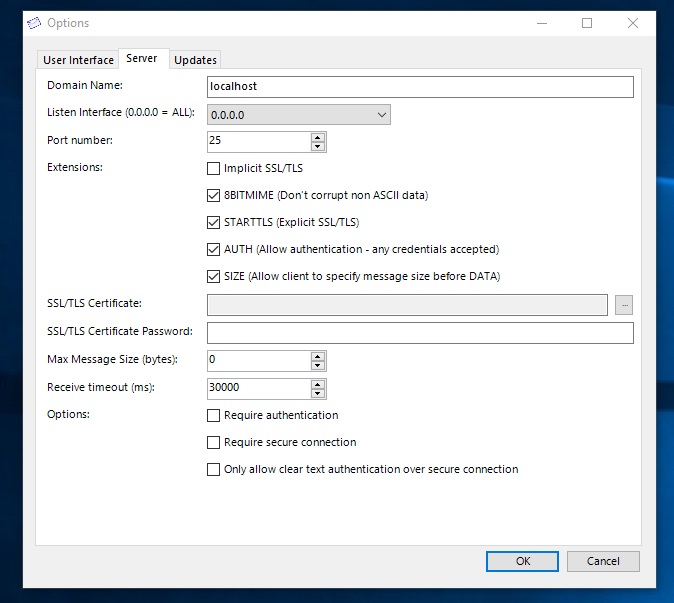 Hier kommt nun smtp4dev – ein dummy SMTP-Server für Windows – ins Spiel. Das Programm lauscht auf Port 25 (oder einem anderen konfigurierten Port) und fängt die ausgehenden Mails ab. Natürlich ist dies über fake sendmail und die entsprechende Konfiguration der php.ini ebenfalls möglich. Jedoch funktioniert smtp4dev ohne ein allfälliges Editieren der php.ini Out of the box. Ausserdem kann das Lauschen auf Port 25 ganz einfach auch wieder abgeschaltet werden. Über die Optionen von smtp4dev lassen sich bequem Server und Port konfigurieren.