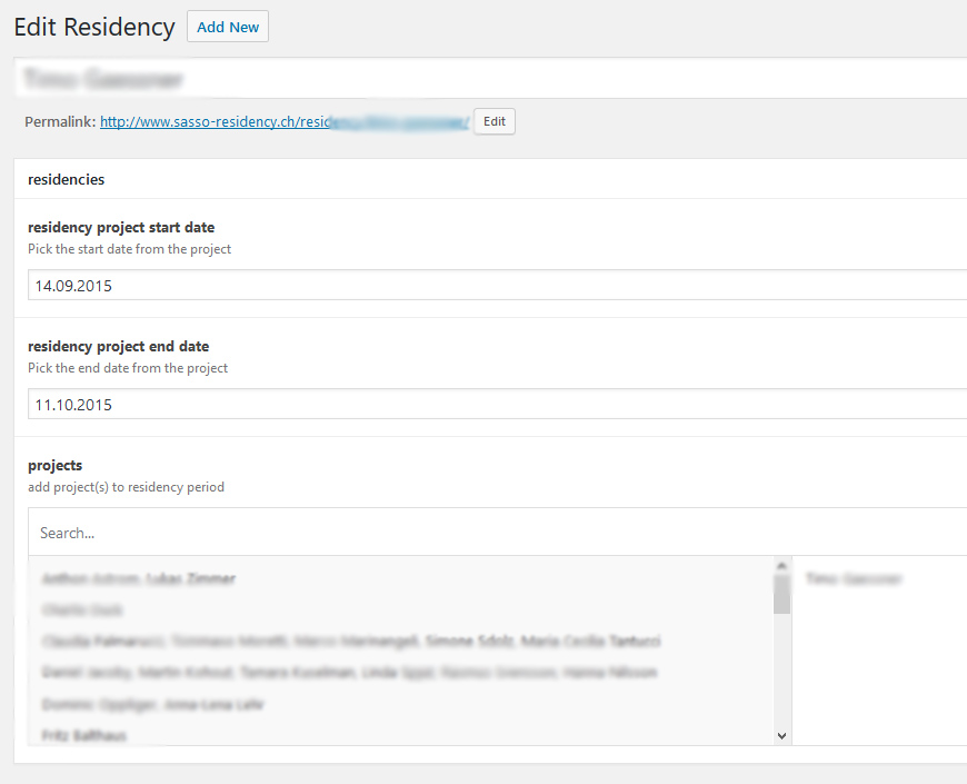 Bild: die benutzerdefinierten Felder ‘startdate’, ‘enddate’ und ‘project’ des custom post type ‘residency’