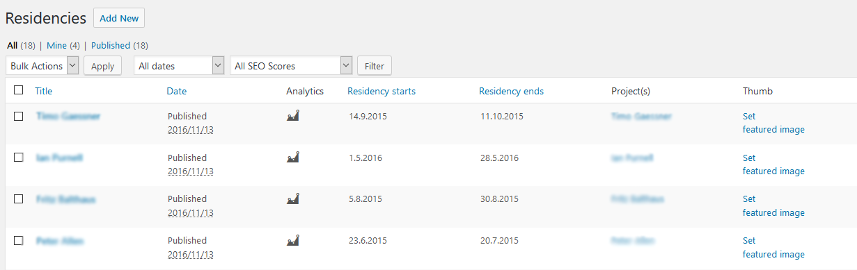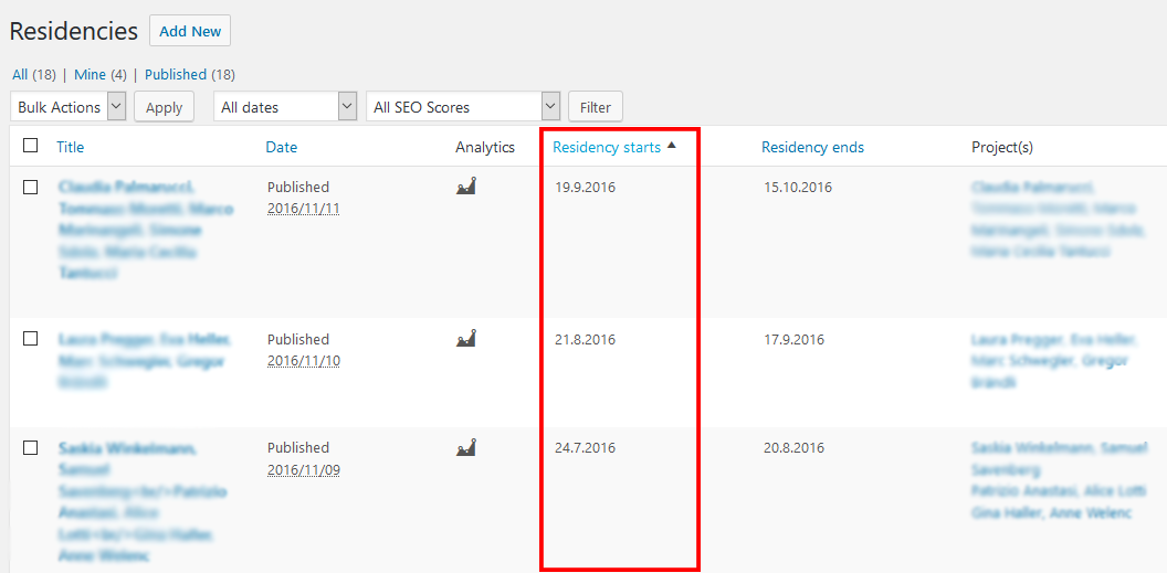Damit können nun die custom posts nach den Werten in den Spalten von Residency starts ‘startdate’ und Residency ends ‘enddate’ sortiert werden.