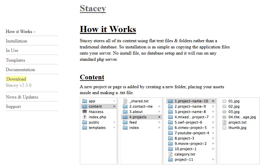 Der grosse Vorteil eines Conent Managment System (CMS) ist die Trennung von Inhalt und Design. Bei den meisten CMS wird der Content in einer Datenbank (DB) gespeichert. Nicht bei Stacey, welches ohne DB auskommt. Inhalte werden bei Stacey durch das Erstellen von Ordnern und das Bearbeiten von Textdateien verwaltet. Damit ist PHP die einzige Voraussetzung um Stacey auf einem Webserver zu betreiben. Stacey findet man zum Download unter: https://www.staceyapp.com/